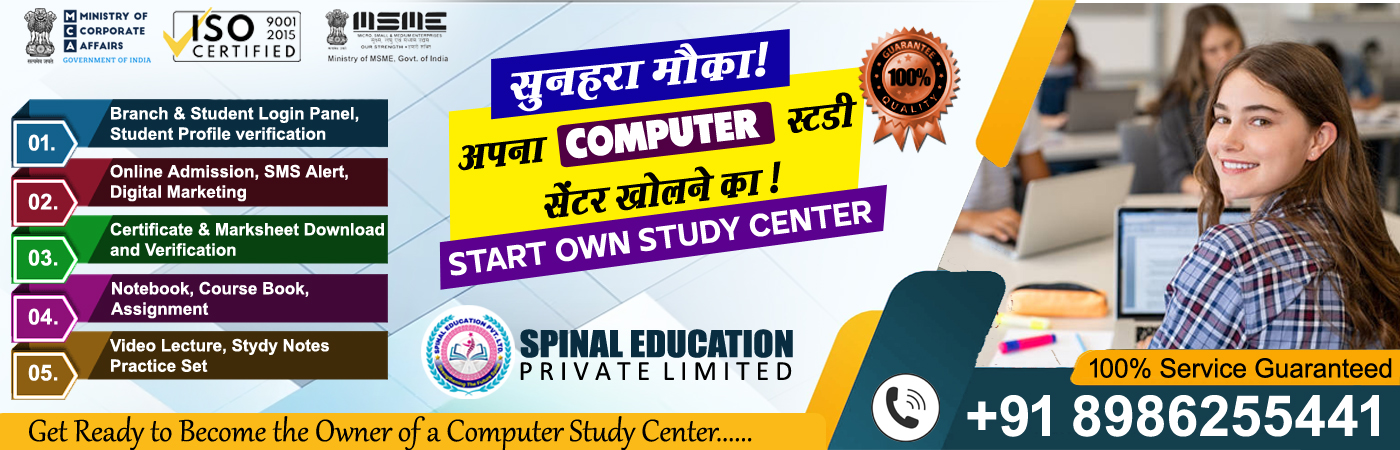Spinal Education Private Limited (SEPL), Ministry Of Corporate Affairs, Govt Of India द्वारा पंजीकृत शिक्षण संस्थान की कंपनी है जैसा की नाम से ही स्पष्ट है की हम नवीनतम और बाजारों के मांग के अनुसार नवीनतम तकनिकी शिक्षा के द्वारा आपके भविष्य की रीढ़ को मजबूत करते है जिससे भविष्य में पड़ने वाले आर्थिक दबाव का आप पर कोई असर न हो | SEPL, कंप्यूटर सूचना प्रौद्योगिकी शिक्षा के क्षेत्र में जागरूकता और उत्कृष्टता के साथ छात्रों को गुणवत्तापूर्ण तकनीकी पाठ्यक्रम और रोजगार के अवसर प्रदान करता है जिससे वे अपने आने वाले कल के लिए आर्थिक स्थति से मजबूती से खड़े रहे।